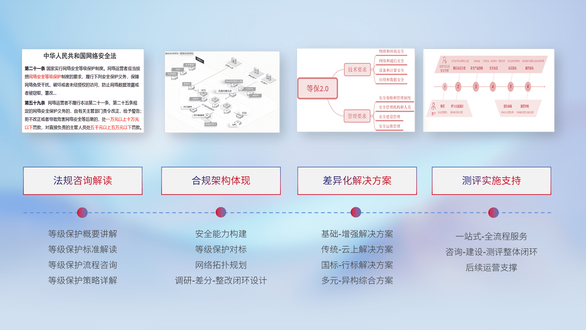 通过专业的法律咨询解读、、合规架构体现、、、、差异化解决方案、、测试实施支持等服务,,,,为客户量身打造等保合规体系。。